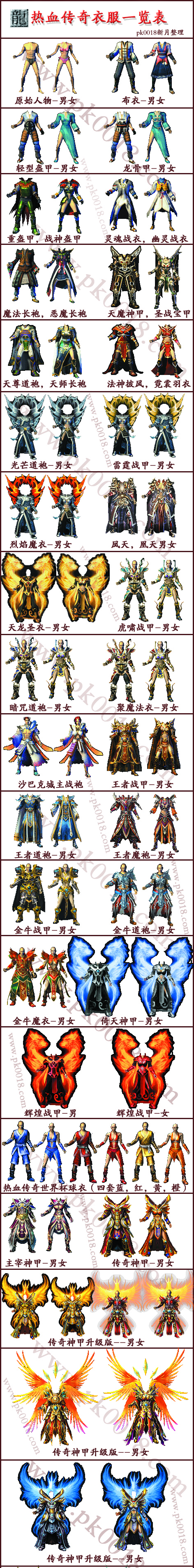 收录了传奇所有的衣服,分别是布衣,轻盔甲,重盔甲,战神盔甲,灵魂战衣,幽灵战衣,魔法长袍,恶魔长袍,天魔神甲,圣战宝甲,天尊道袍,天师长袍,法神披风,霓裳羽衣,光芒道袍,雷霆战甲,烈焰魔衣,凤天魔衣,凰天魔甲,天龙圣衣,虎啸战甲,暗咒道袍,聚魔法衣,城主战袍,王者魔袍,王者战甲,王者道袍,金牛战甲,金牛魔衣,金牛道袍,倚天神甲,辉煌神甲,热血球衣,主宰神甲,传奇神甲,皓天,皓月,皓尊神甲,热血战甲,热血道袍,热血魔衣,神龙神甲,真龙神甲,金马神甲,灵马神甲,天马神甲,灵羊神甲,金羊神甲,神羊神甲,齐天大圣神甲,灵凤神甲,金凤神甲,神凤神甲,啸天神甲,啸月神甲,啸尊神甲,银亥神甲,金亥神甲,元帅神甲,鼠年,社君,子神,天节神甲。